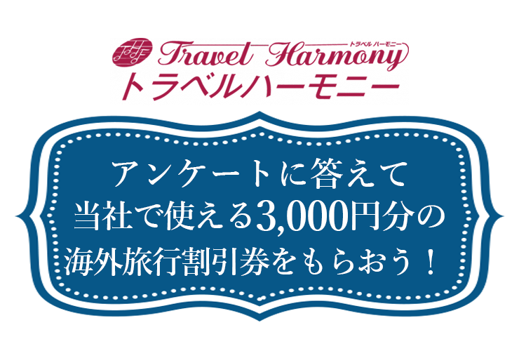 アンケートにお答えいただいた方の中から抽選で20名様に、当社で海外旅行代金に使える3,000円分の割引券をプレゼントいたします。
