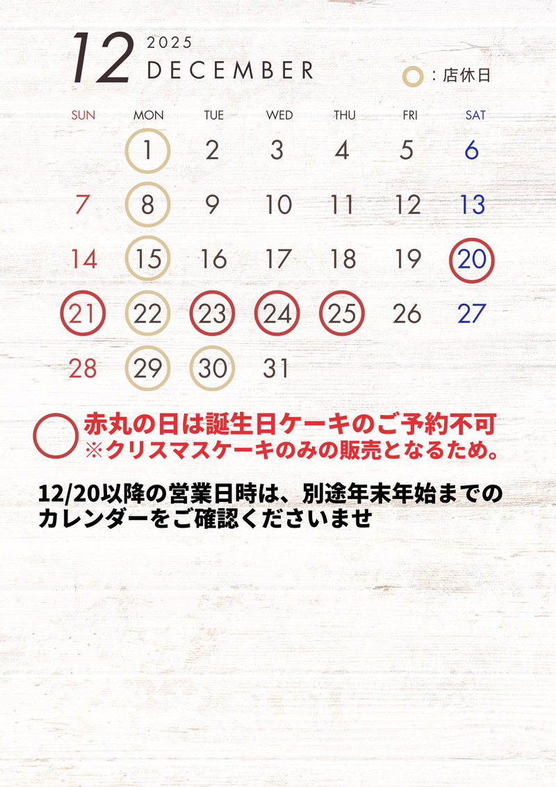 12月20日(土)〜25日(木)はクリスマスケーキのみの販売となるため、誕生日ケーキのご予約は承れません。何卒ご理解くださいますようお願い申し上げます。