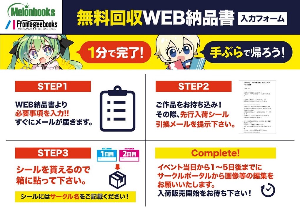 ※イベント当日を除き、web納品書にて初めてイベント新刊のご案内をご申請されるサークル様は、先んじて弊社サークルポータルからのご申請をお勧めしております。弊社通販での事前予約等がスムーズに進行いたしますので、何卒ご協力の程お願い申し上げます。