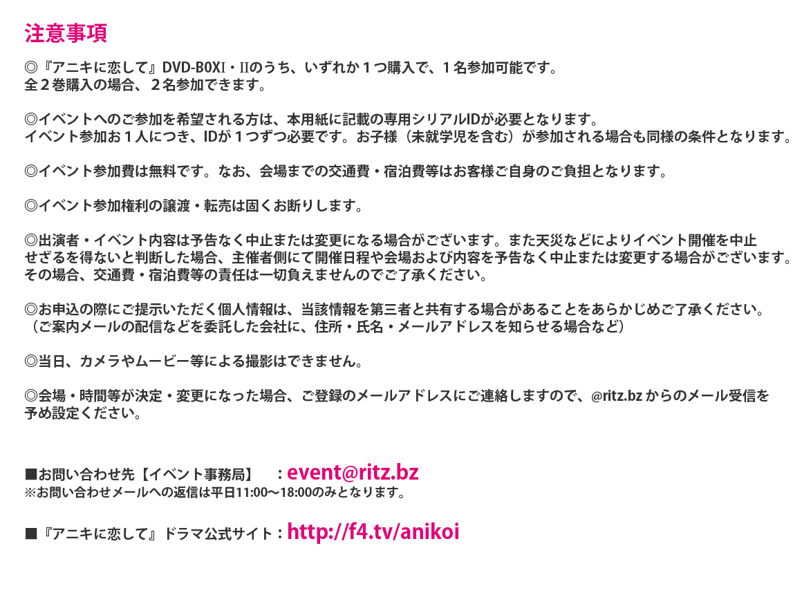 ※「アニキに恋して」DVD-BOXⅠ(CRJP-15)もしくは、DVD-BOXII (CRJP-16) に記載のシリアルナンバーをご記入ください。