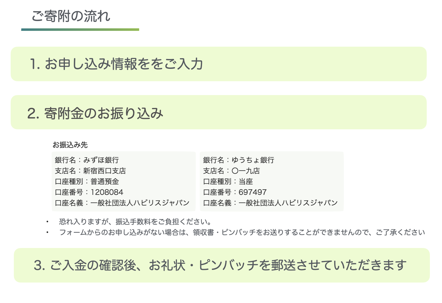 私は、一般社団法人ハビリスジャパンの趣旨に賛同し、寄附を申し込みをいたします。