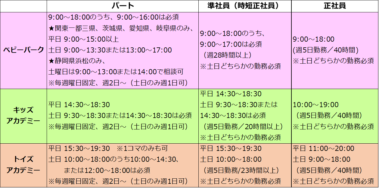 ※正社員・準社員は土日どちらかの勤務が必須となり、曜日は弊社にて決定させていただきます(土or日曜の相談可)。