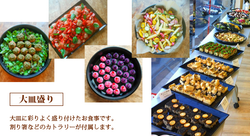 ご予約の人数により大皿の数が変わります。メニューは7~8品。目安としては8名様の場合3~4枚の大皿でご用意します。