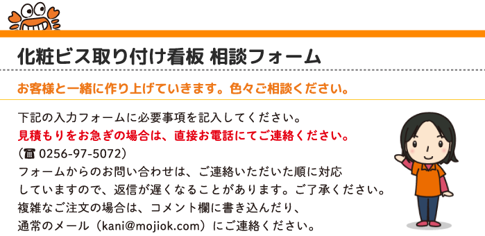 例:こんな壁に合うのは?、どんな看板が目立つの?、オススメのデザインを教えて欲しいなど。担当者からご提案させていただきます。