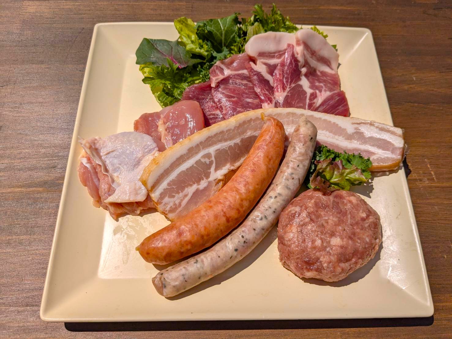 BBQセット(4人前) 1140g 【べるが特製ハンバーグ2個200g、 豚肩ロース8枚280g、鶏モモ4カット200g、 ソーセージ4本(シポラタ、粗挽き)、厚切りベーコン (ソーセージと厚切りベーコン合わせて460g) 】 ※ハンバーグには尾白の湯の源泉から煮詰めてできた温泉由来の塩(信玄の涙)を使用しています。
