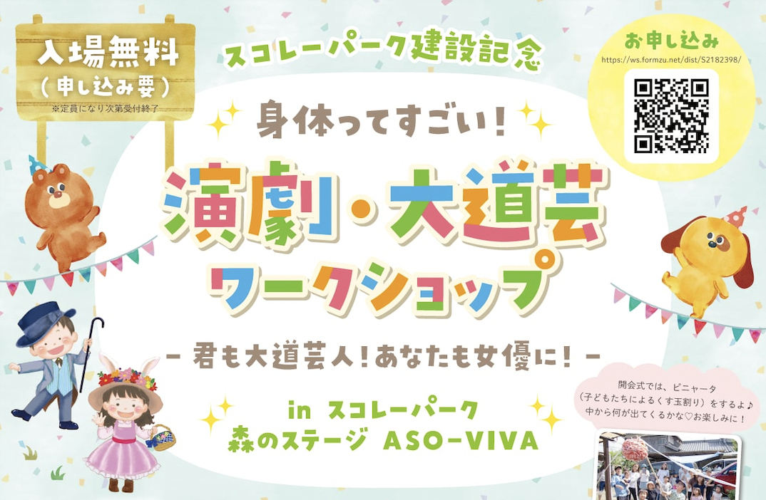 スコレーパークの建設を記念して、子どもたちが身体を使う楽しさ、喜びを感じられる演劇やショー、ワークショップを開催します。ぜひご参加ください。