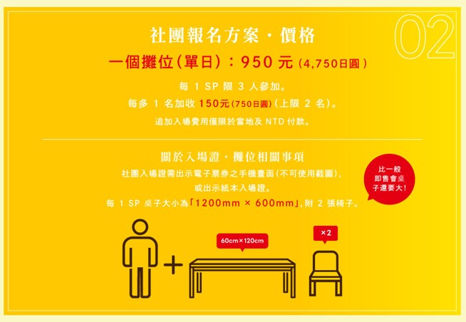 ※每1SP 桌子大小為「1200mm × 600mm」,附 2 張椅子。
