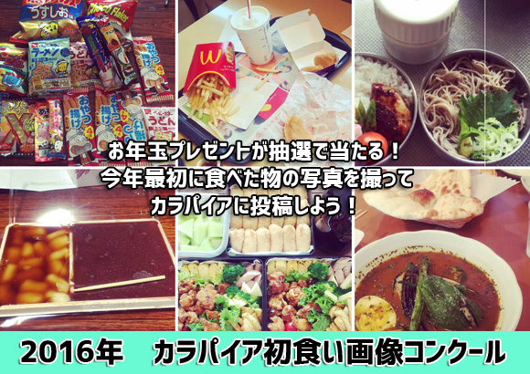 2016年、最初に食べた物の画像を送ってください。送っていただいた写真はカラパイア紙面で紹介いたします。また、投稿してくれた人の中から抽選でアマゾンギフト券などのプレゼントが当たります。